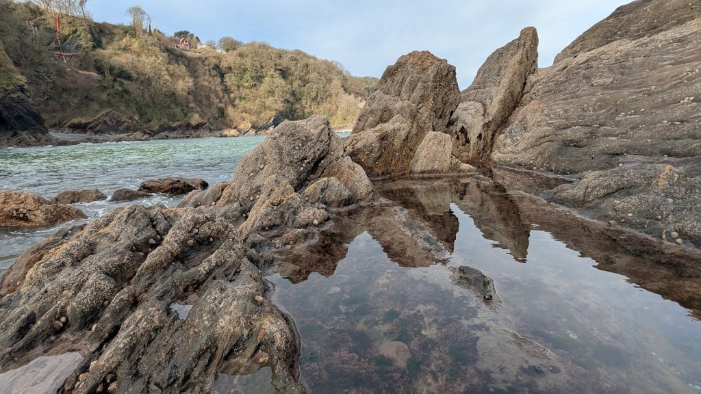 We checked out the rockpools for signs of life and jumped over puddles. We contemplated getting the wetsuits and bodyboards out, inspired by the surfers but decided we were having so much fun that we didn’t need the extra hassle just then. We brought Winter wetsuits with boots and gloves with us, just in case.